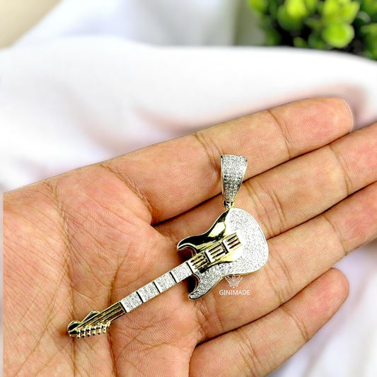 Gold Guitar Pendant – Iced Out CZ Electric Guitar Necklace – Hip Hop Rock Jewelry – Bling Musician Gift – Men’s Statement Chain Charm.