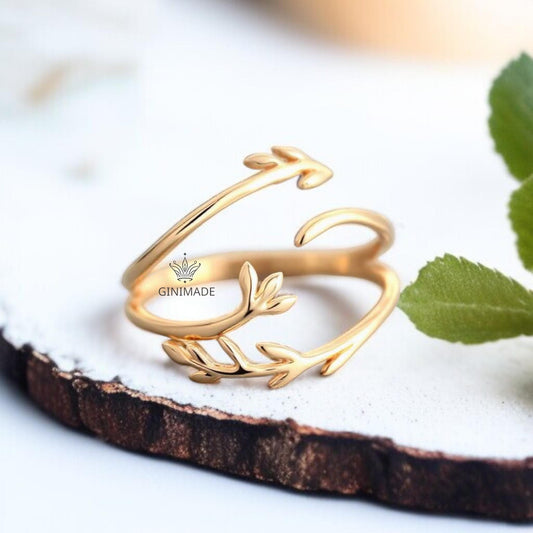 Adjustable Gold Leaf Branch Ring | Dainty Nature Inspired Ring for Women | Minimalist Botanical Jewelry Gift | Gold Plated Twig Ring