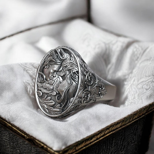 Love Faces Ring – Sterling Silver Man Floral Pattern Ring | Unisex Signet Ring | Unique Silver Gift for Lovers & Soulmates