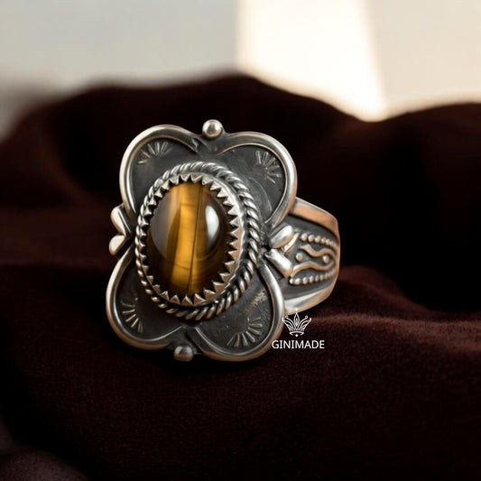 Vintage Tiger Eye Statement Ring Sterling Silver Boho Ring for Men & Women Southwestern Tribal Jewelry Handmade Gemstone Ring Gift