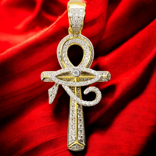 Egyptian Ankh & Eye of Horus Cross Pendant – 14K Gold Plated Silver with CZ Diamond