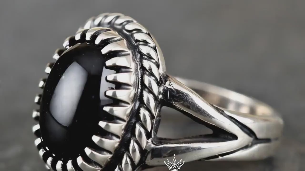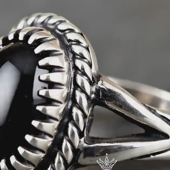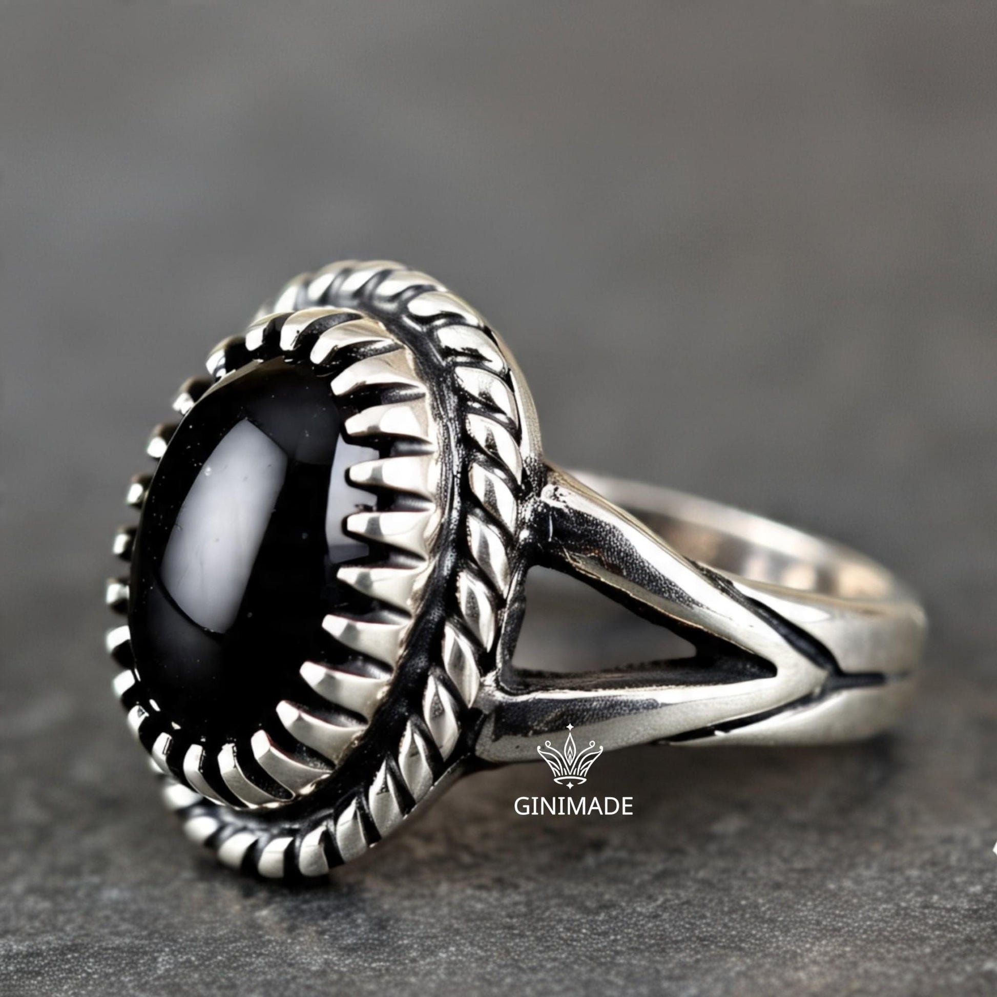Elevate your style with this stunning handcrafted black onyx ring, made from solid 925 sterling silver. The bold, faceted oval black onyx stone is beautifully set in a vintage-inspired bezel, surrounded by intricate silverwork with oxidized detailing that enhances its antique charm.