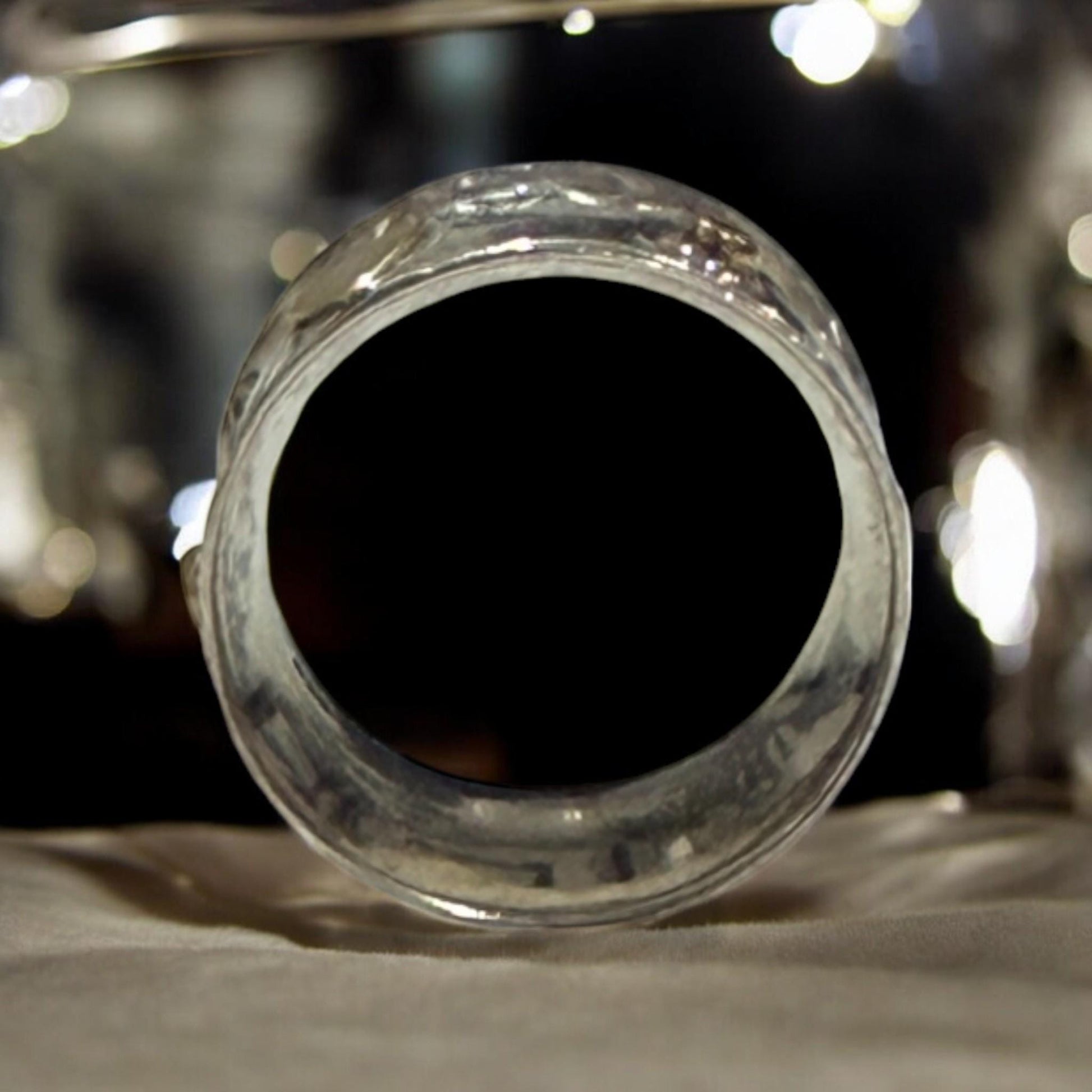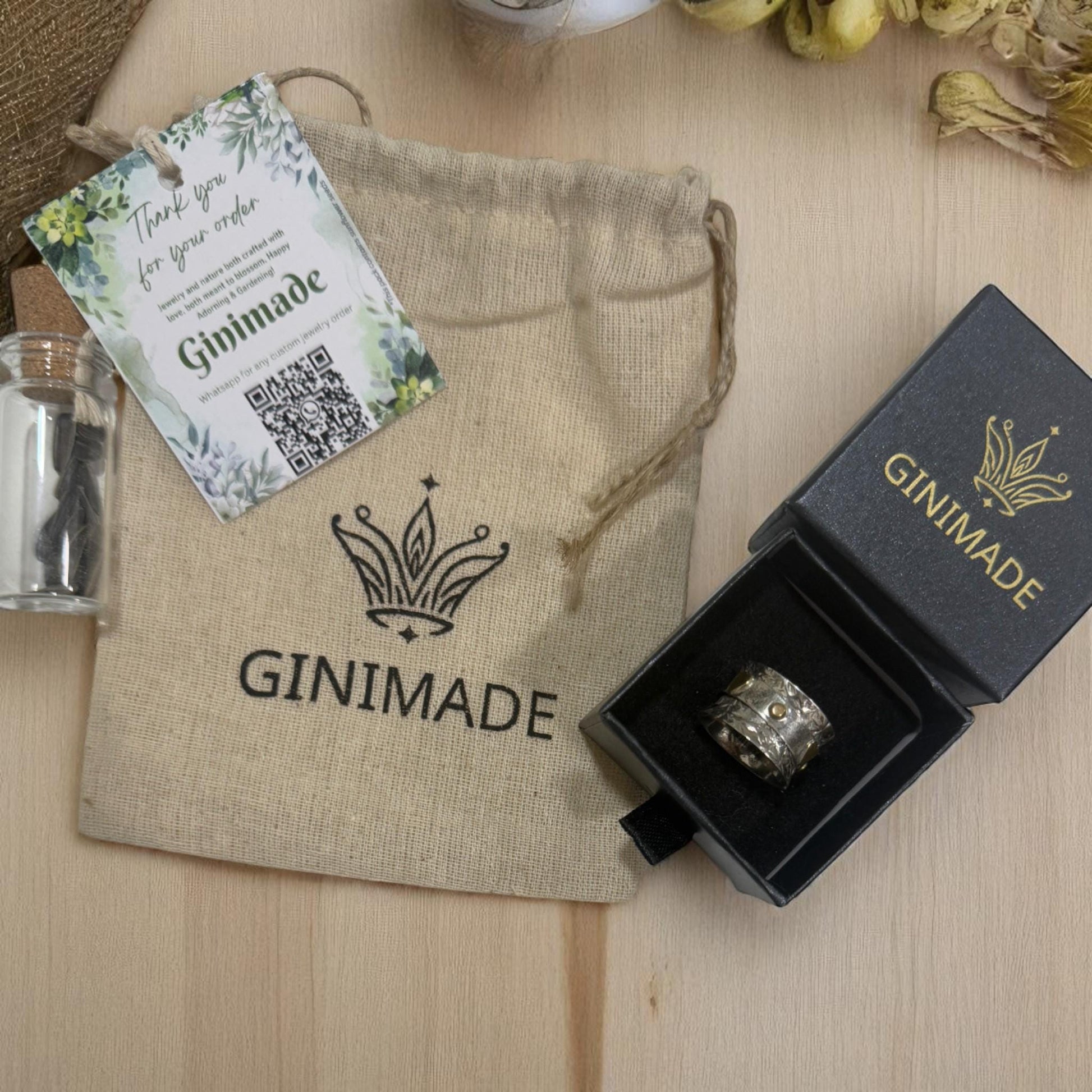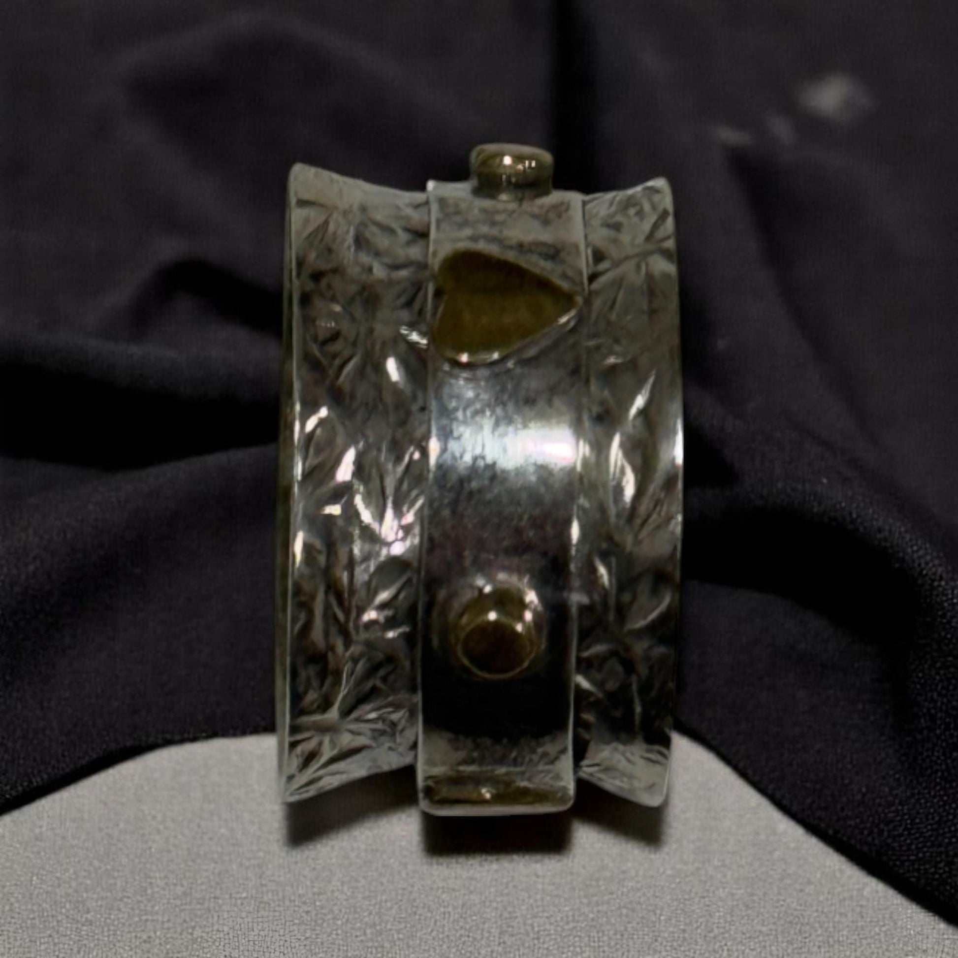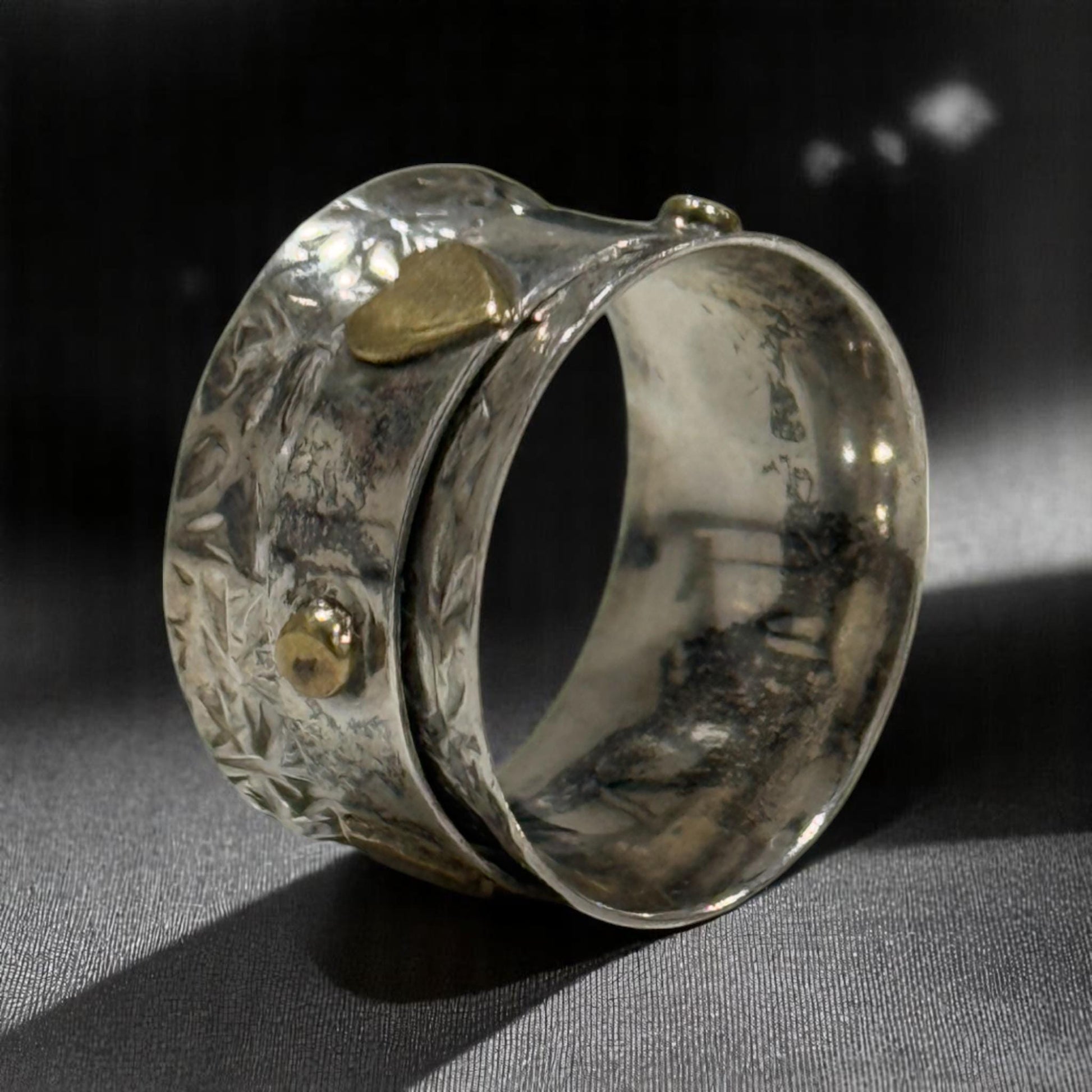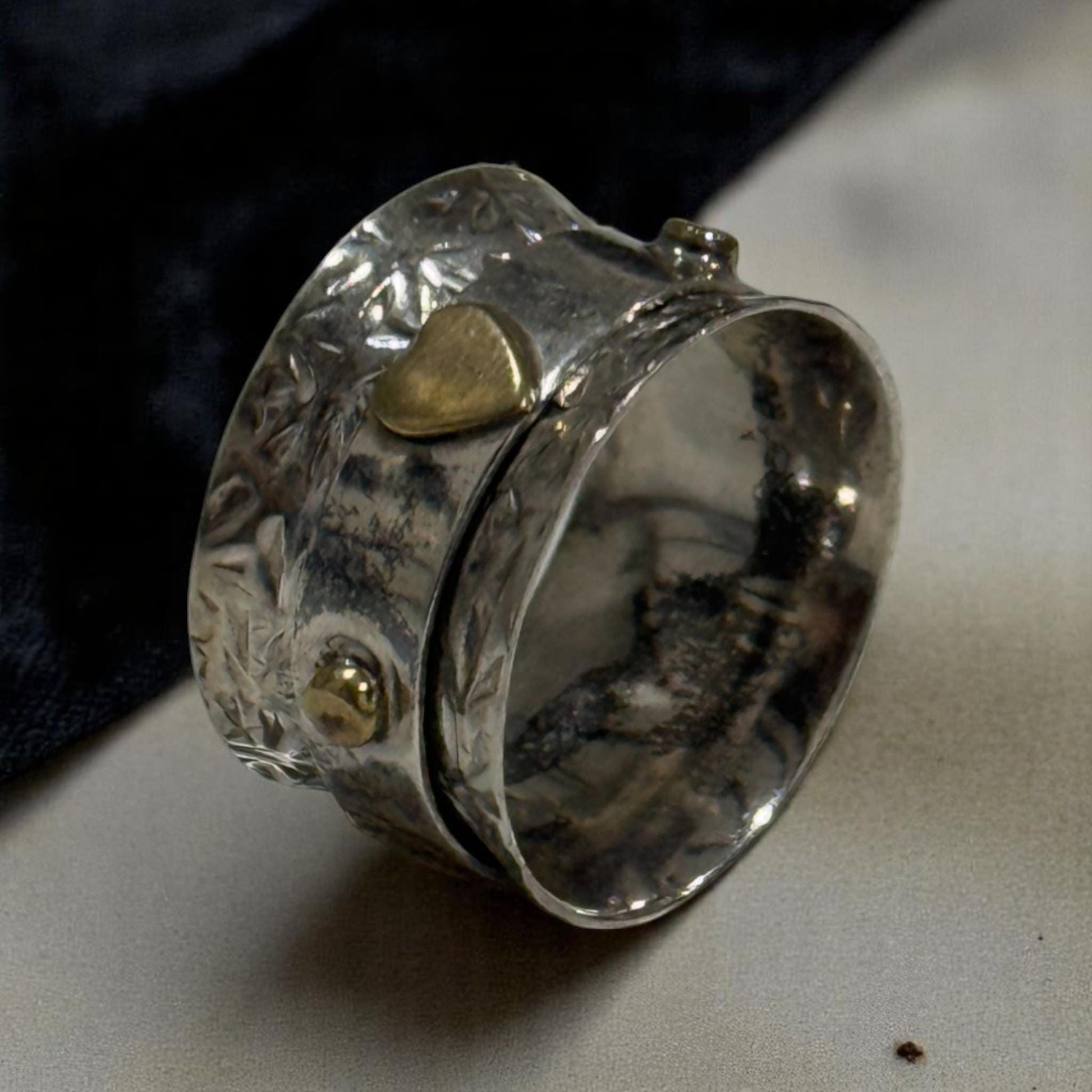 Introducing our Handcrafted 925 Sterling Silver Spinner Ring, a one-of-a-kind piece where rugged elegance meets thoughtful design. This textured silver band features hand-etched botanical patterns, adorned with a rustic 925 silver base and detailed with solid brass and gold accents — including a symbolic heart that gently spins around the band. More than just a ring, it's a tactile reminder of mindfulness, love, and personal strength.