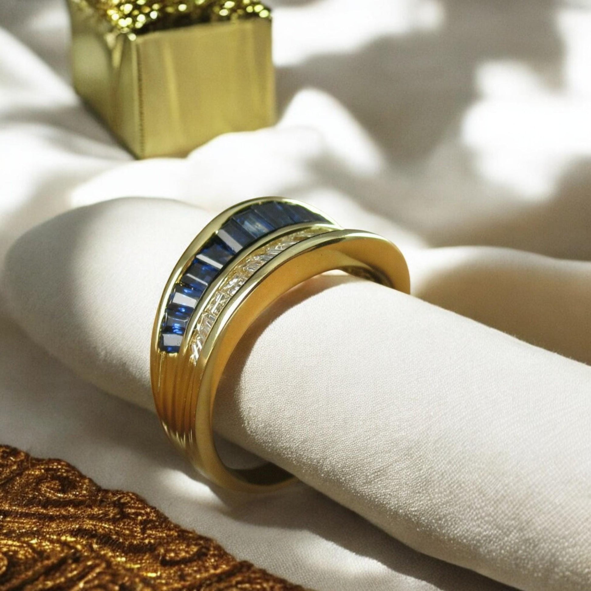 Step into a world of elegance with our stunning baguette-cut simulated sapphire and diamond band ring. This exquisite piece is more than just jewelry—it's a story of timeless sophistication and modern artistry.