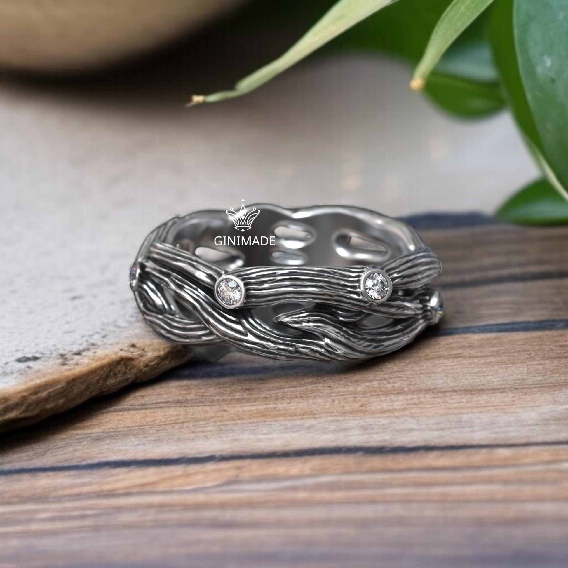 Boho Nature-Inspired Branch Ring β Sterling Silver Tree Bark Band with Diamonds β Organic Woodland Engagement or Promise Ring
