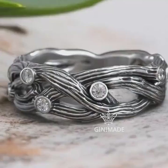 Beautifully handcrafted in a tree bark texture, this silver ring features organically flowing branches accented with sparkling diamonds, mimicking natureβs raw beauty. Ideal as a promise ring, wedding band, or simply a unique everyday piece for lovers of the earth and artful jewelry.