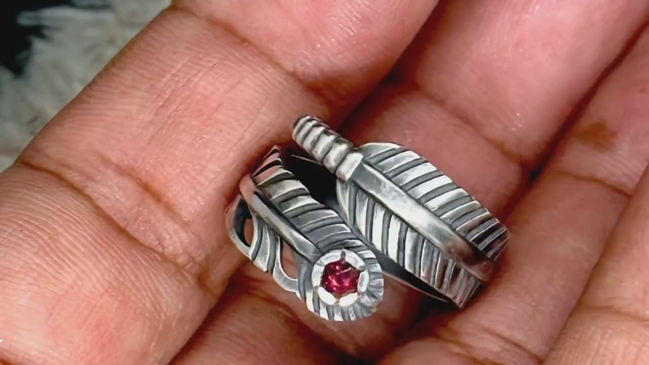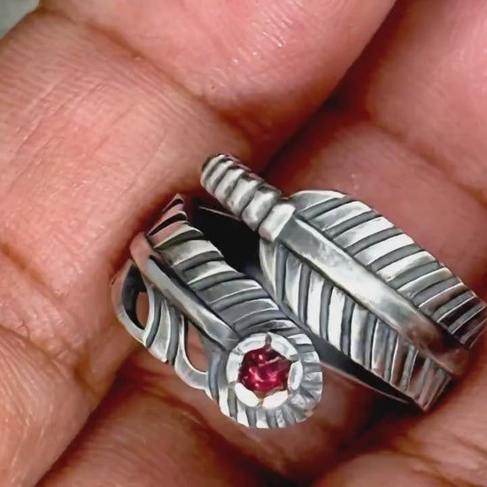 Feather Wrap Ring with Natural Rhodolite | 925 Sterling Silver Boho Ring | Adjustable Bird Feather Ring | Gift for Her | Handmade Jewelry.