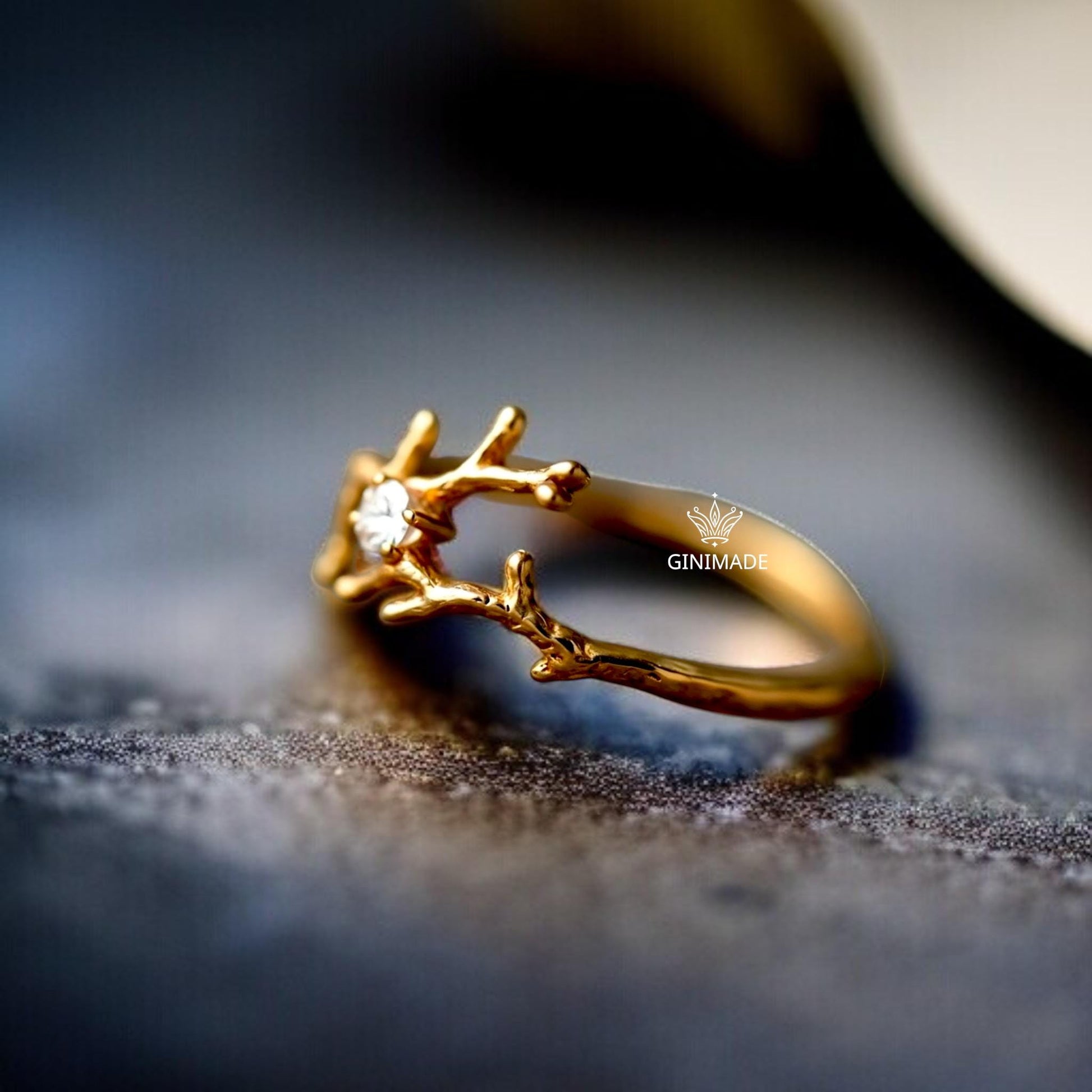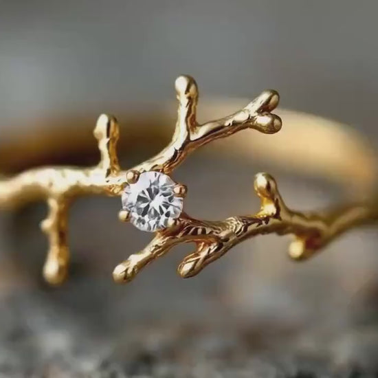 Gold Twig Branch Ring with CZ Diamond | Nature Inspired Gold Plated Band | Woodland Engagement Ring | Dainty Tree Branch Jewelry Gift