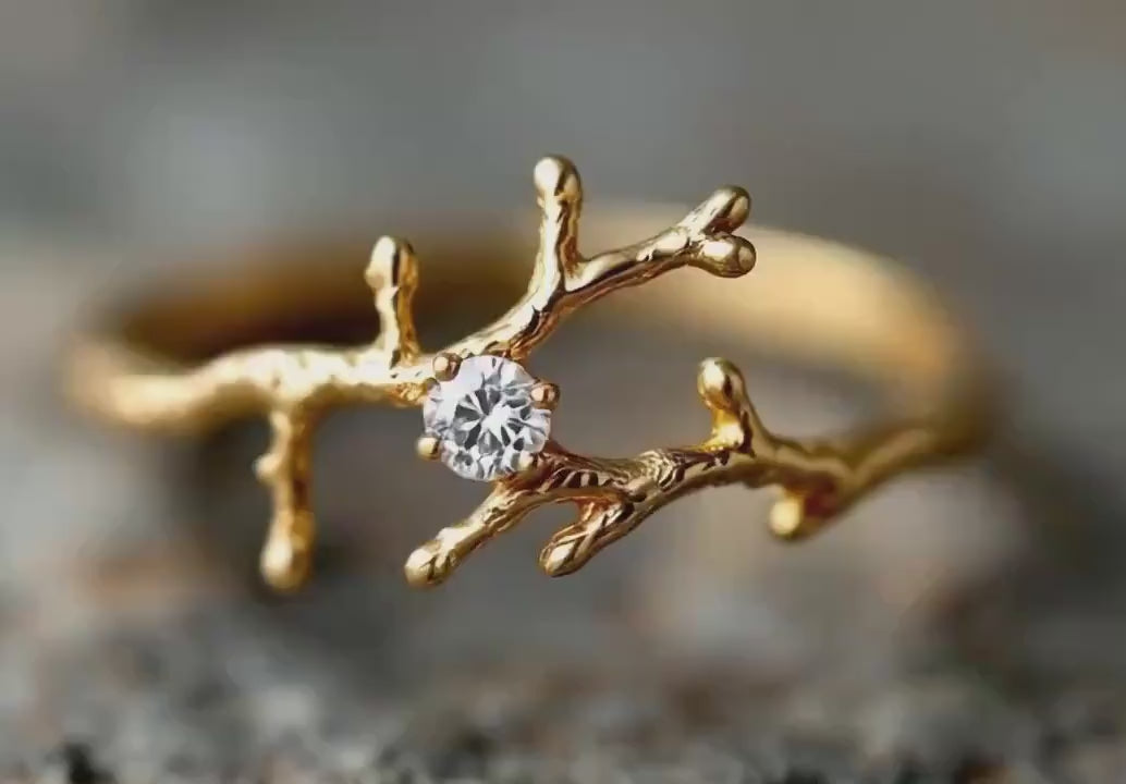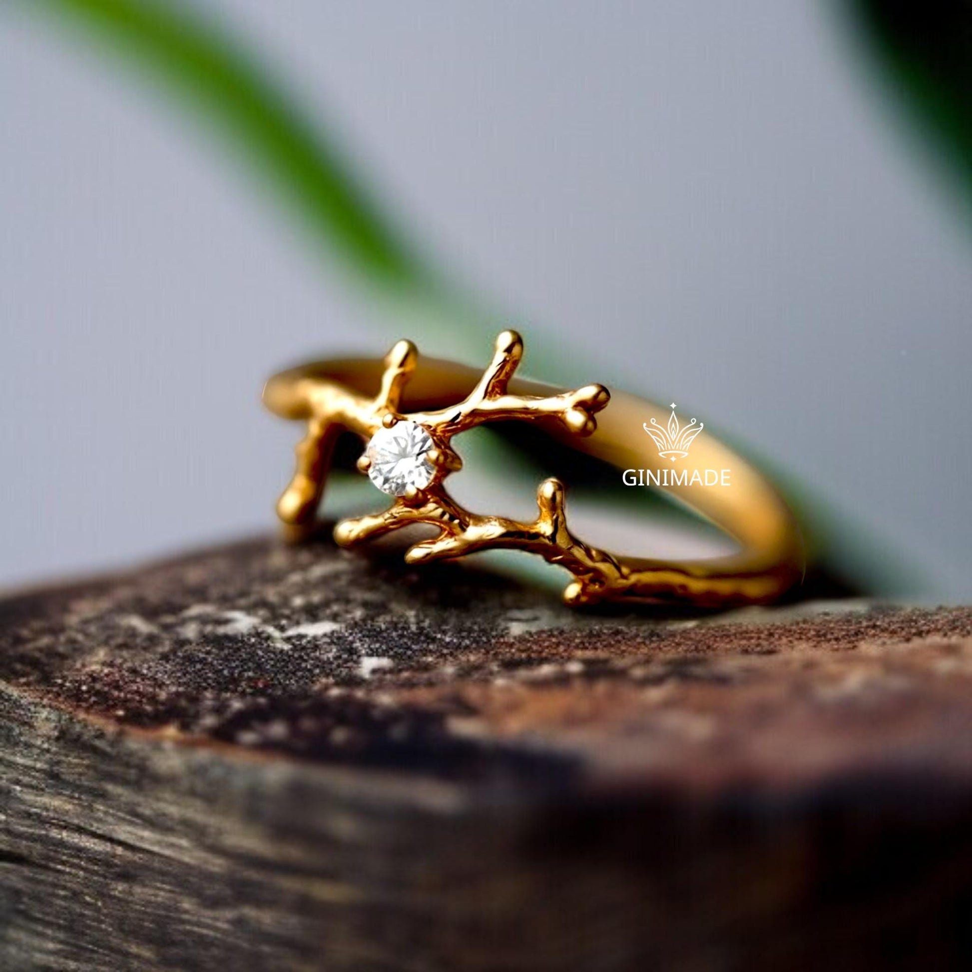 Bring a touch of the forest to your fingers with this exquisite gold twig branch ring, featuring a delicate cubic zirconia stone nestled between intricately crafted tree-like branches. Inspired by the elegance of nature, this piece evokes the serenity of a woodland trail and the charm of minimalist organic design.