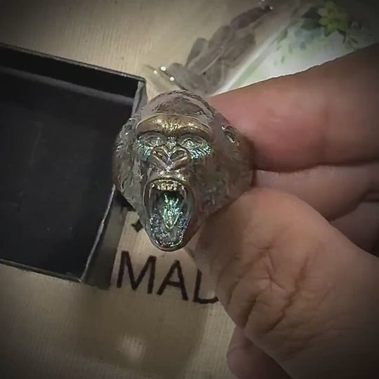 Each ring is carefully hand-carved and cast to highlight the intense expression and textured fur of the gorilla, capturing every wrinkle, snarl, and detail. The solid sterling silver construction ensures durability, while the high-polish and oxidized finish give it a rugged yet refined look.
