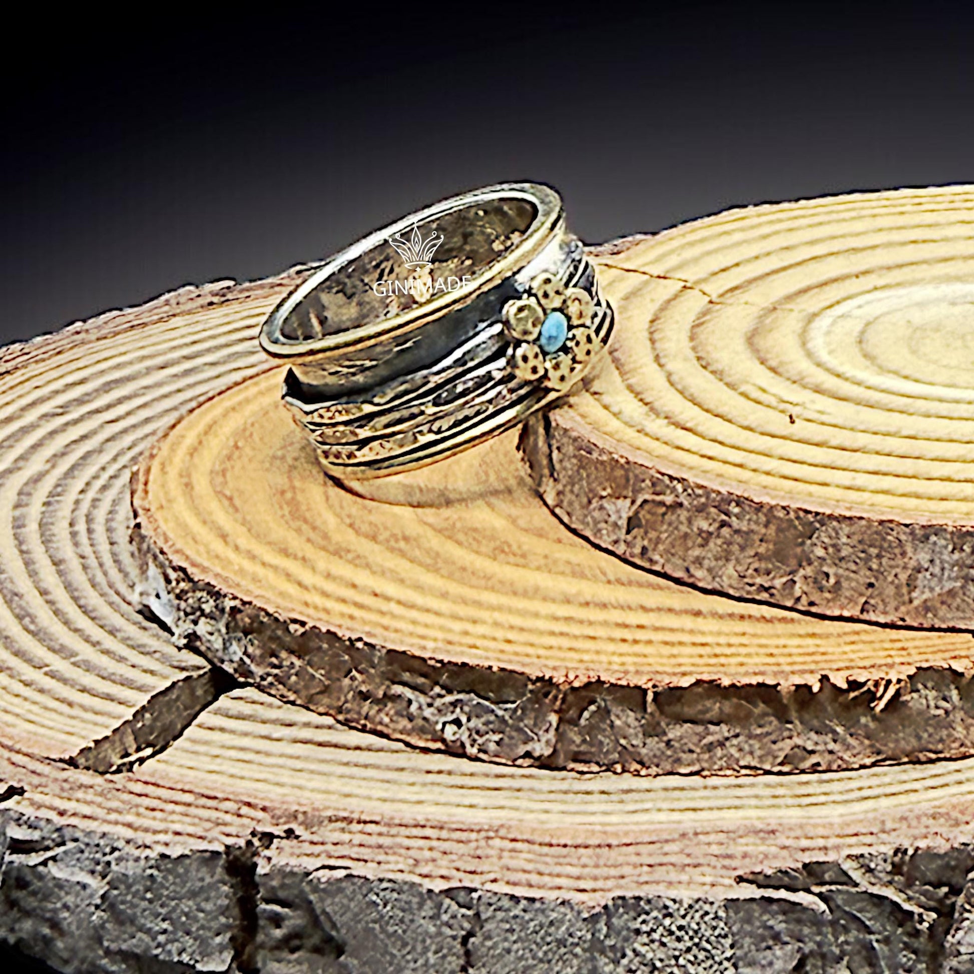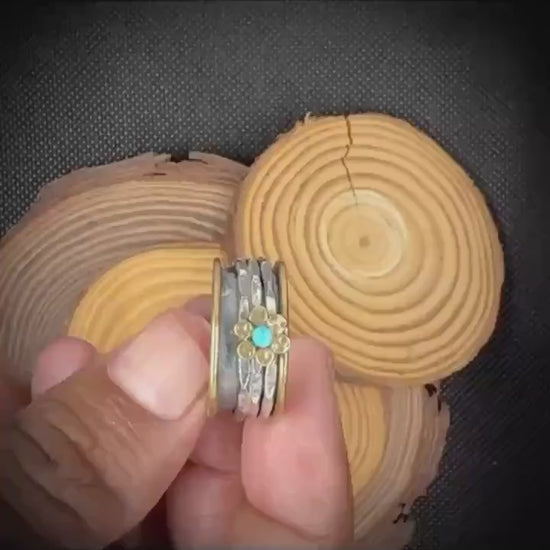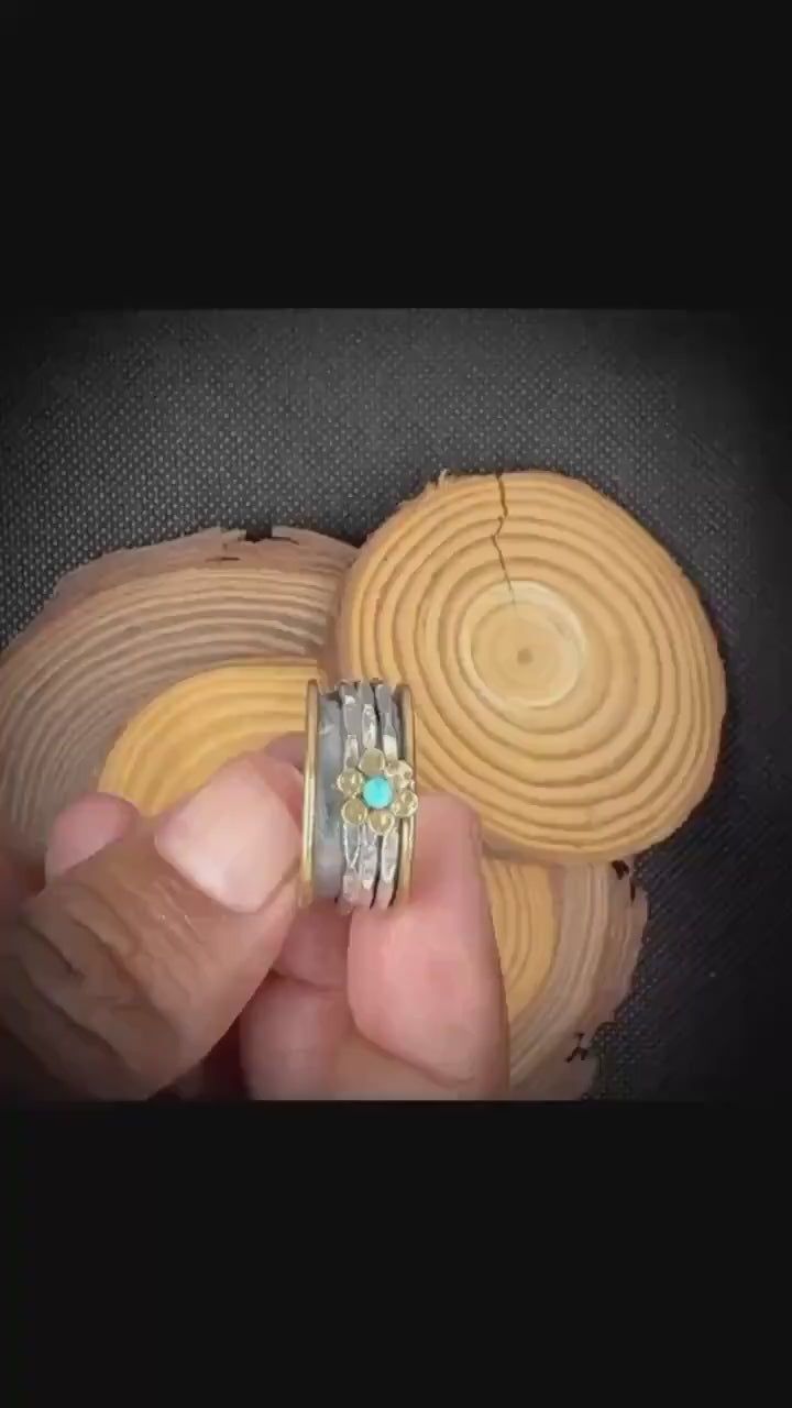 Add a touch of artisanal charm to your jewelry collection with this stunning handmade mixed metal spinner ring from GINIMADE. Crafted from sterling silver and brass, this unique piece features a hammered texture and a delicate flower motif with a vibrant turquoise gemstone at its center. The spinning bands offer a calming, fidget-friendly design, making it both stylish and functional.