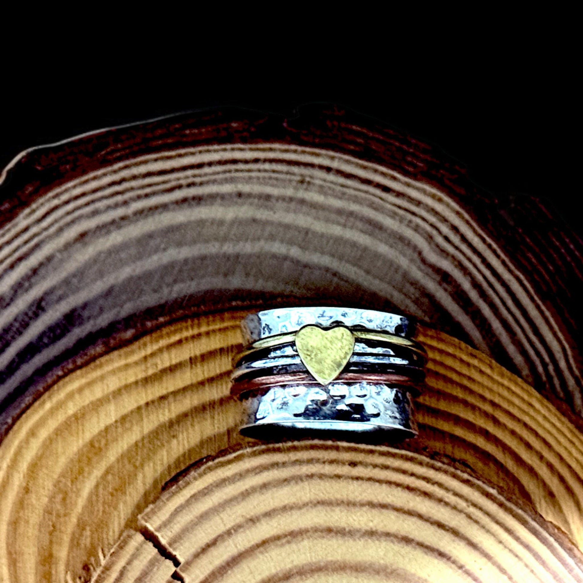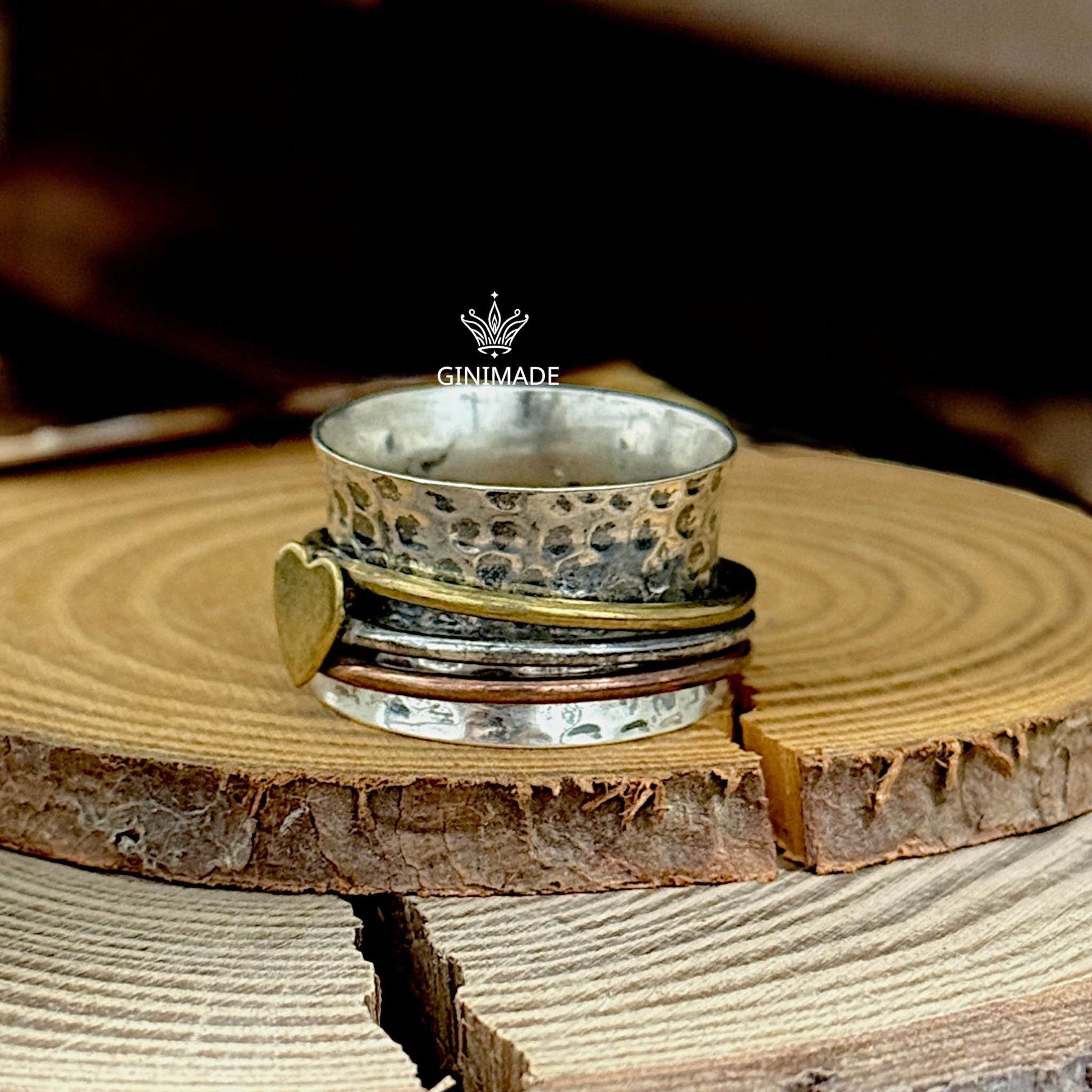 Find comfort and calm with this beautiful handmade heart spinner ring by GINIMADE. Designed with a wide, hammered sterling silver band and adorned with three spinning rings in brass, copper, and silver, this ring is both meaningful and eye-catching. The brass heart charm adds a touch of love and warmth, making it perfect for gifting or treating yourself.