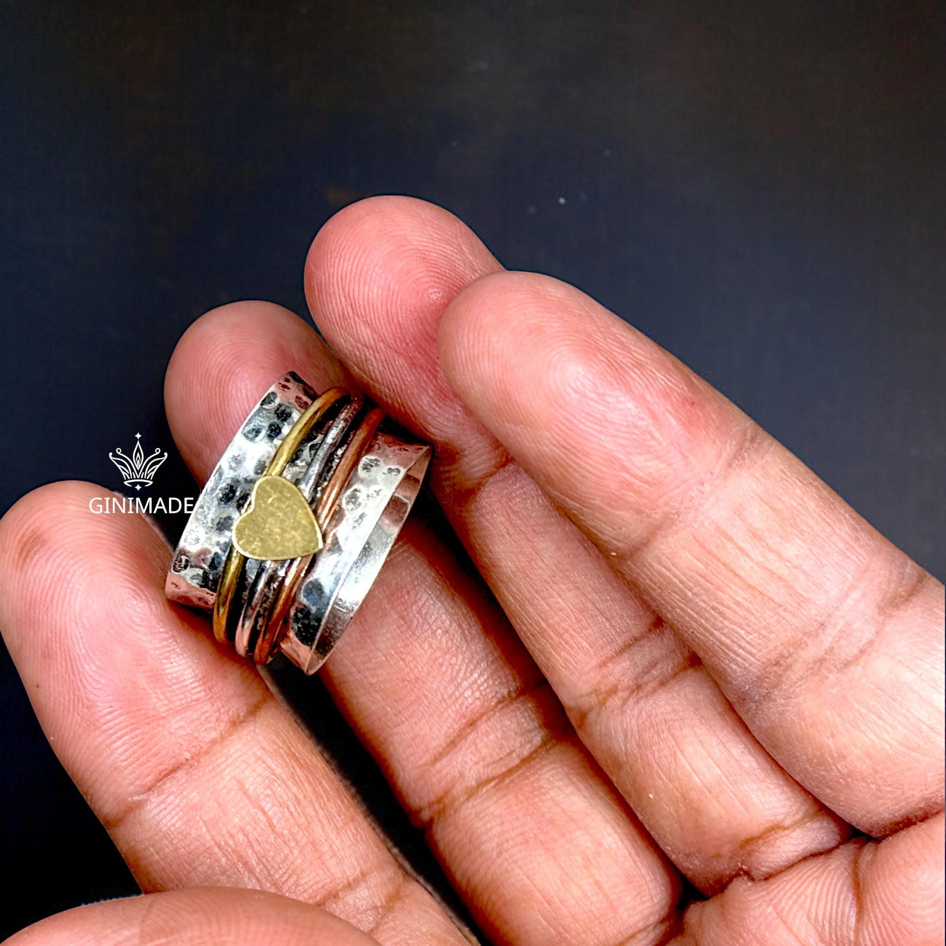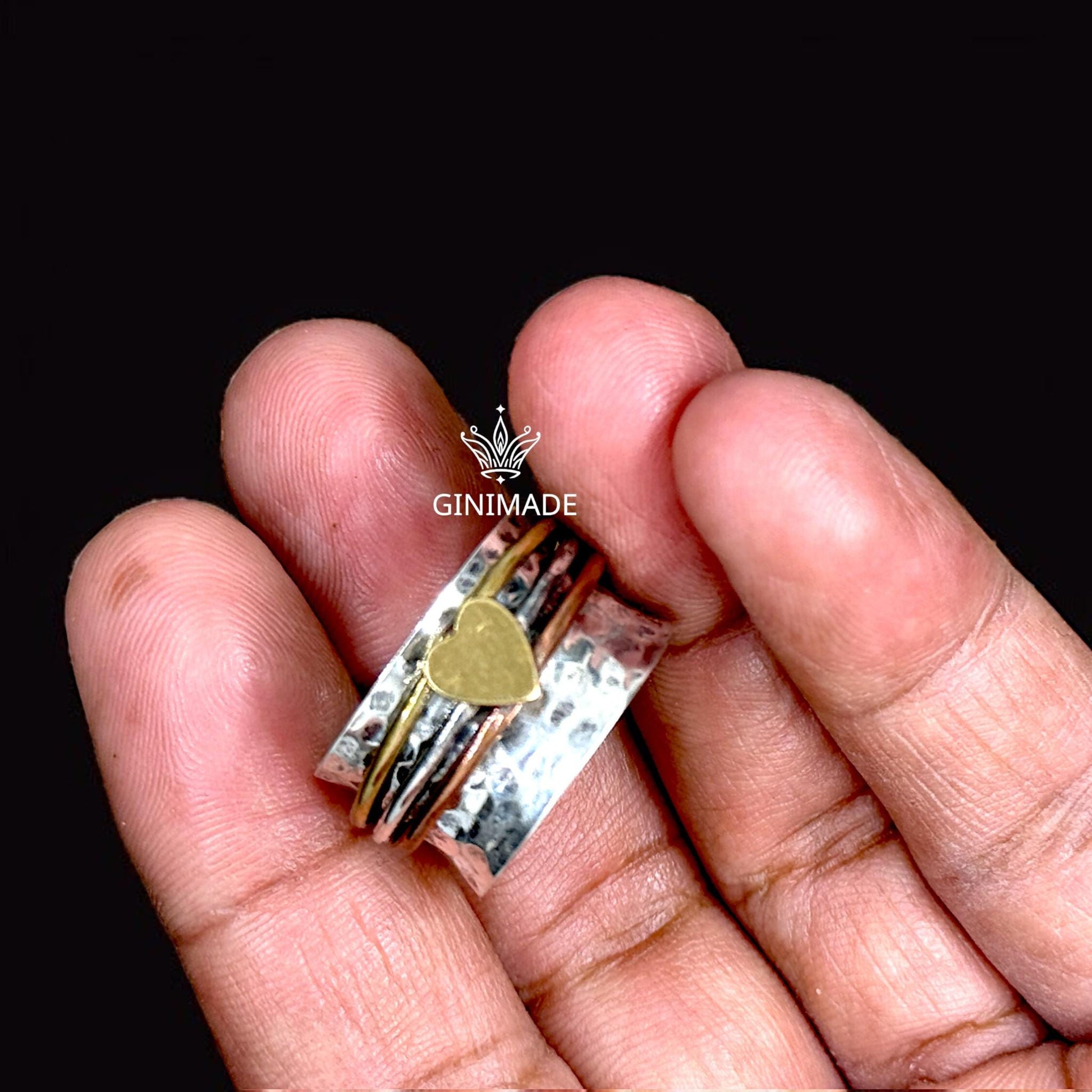 Heart Spinner Ring | Sterling Silver Mixed Metal Fidget Ring Handmade Wide Band Boho Ring | Brass Copper Accent | GINIMADE