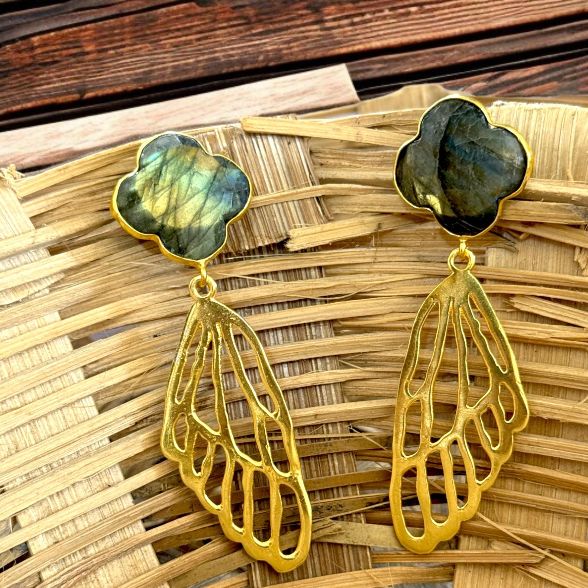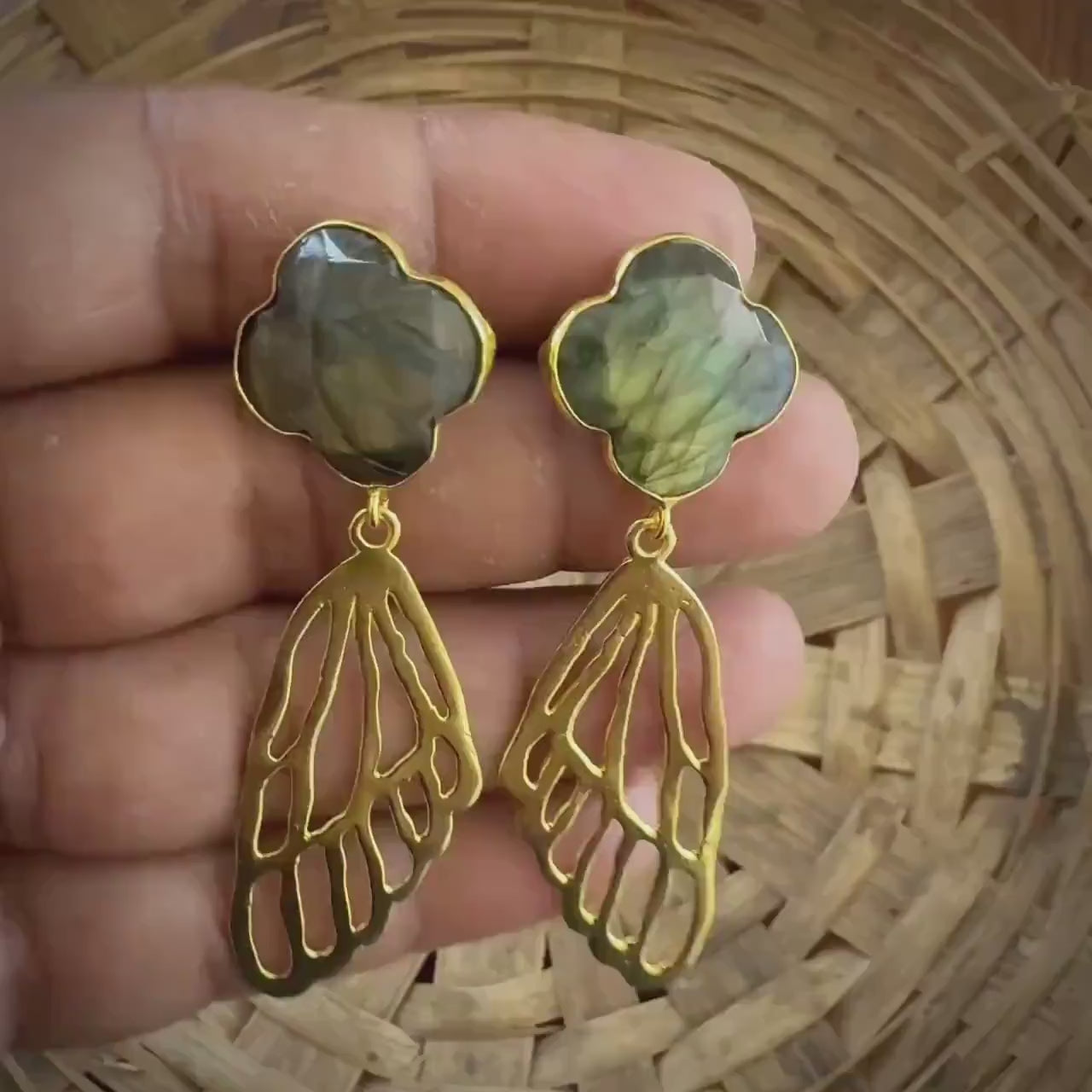 Design: Clover-shaped labradorite studs with butterfly wing dangles
