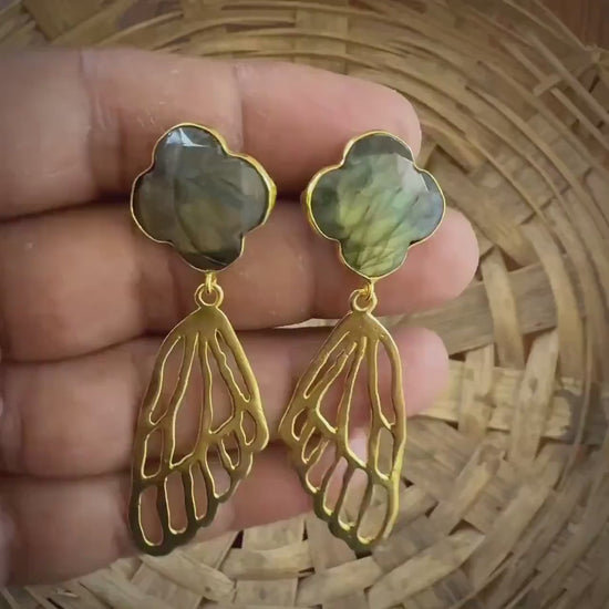 Design: Clover-shaped labradorite studs with butterfly wing dangles