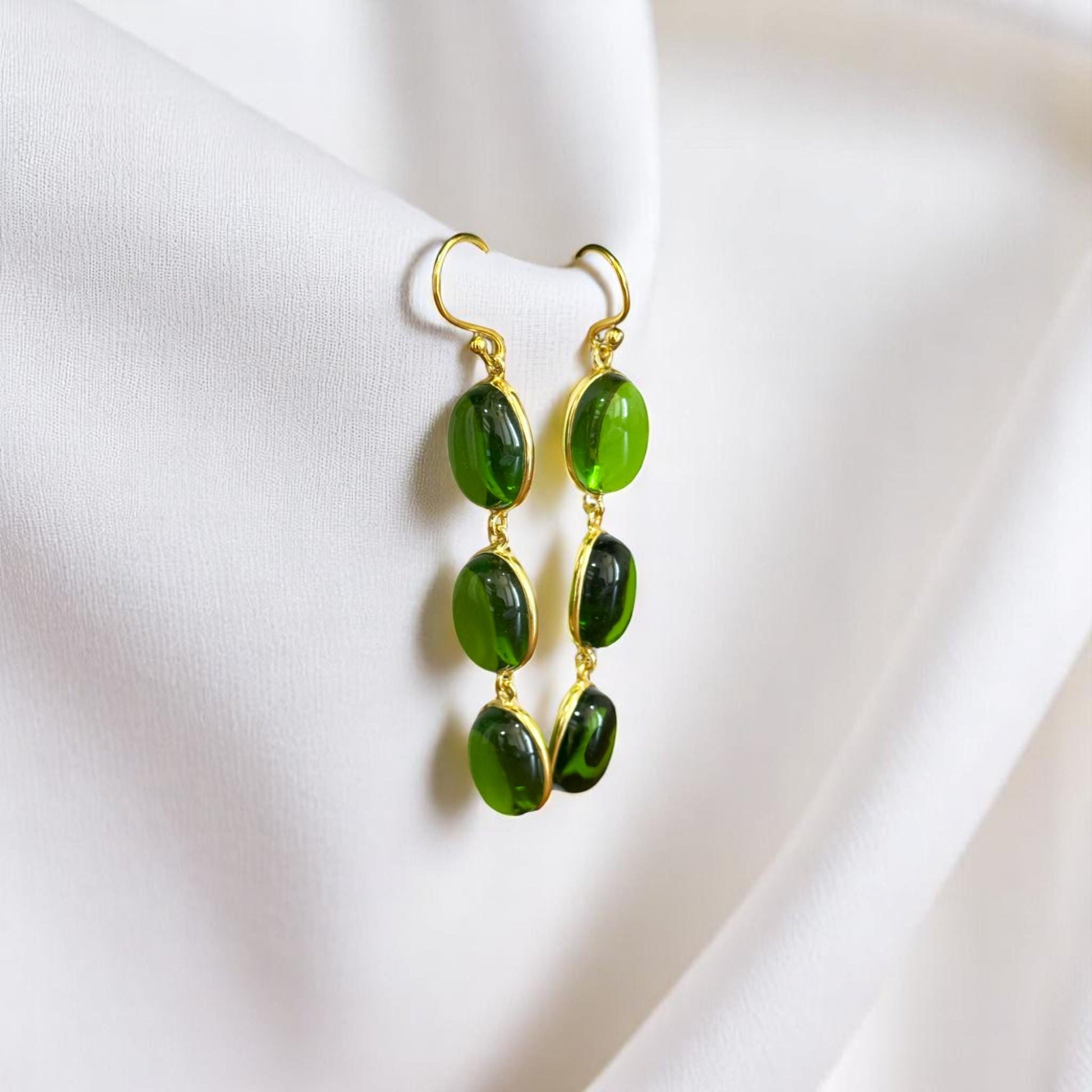 Lush Green Drops – 3-Stone Brass Earrings – Handcrafted Bohemian Chic.