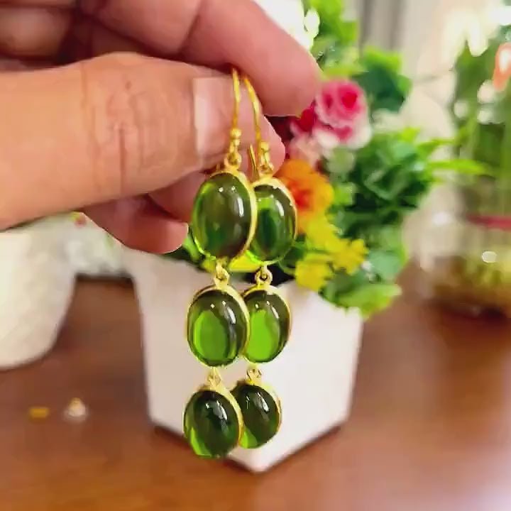 Step into elegance with these handcrafted Green Glass Gemstone Drop Earrings, where earthy charm meets timeless beauty. Each pair is lovingly made by hand using deep green glass stones that reflect light like natural gemstones, set in radiant brass bezels for a warm, vintage glow. Their graceful triple-drop design gives them the perfect length to make a statement—without feeling too heavy or bold.