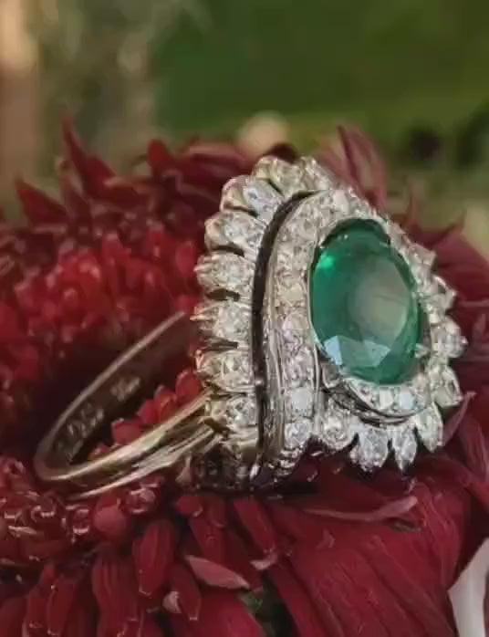 The vibrant green of the natural emerald, known as the "stone of eternal love," takes center stage, symbolizing growth, harmony, and passion. Surrounding the emerald are dazzling lab-grown diamonds, ethically sourced and environmentally friendly, offering the brilliance and clarity of traditional diamonds without the environmental impact.