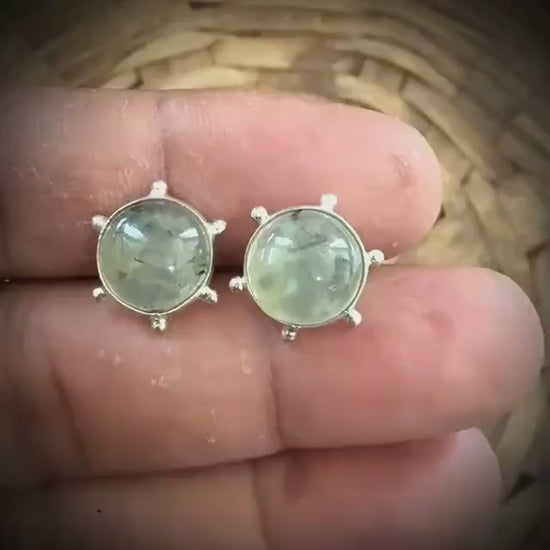 Moss Agate Brass Stud Earrings – Round Cabochon Silver Finish Earrings – Handmade Minimalist Gemstone Jewelry Gift for Her