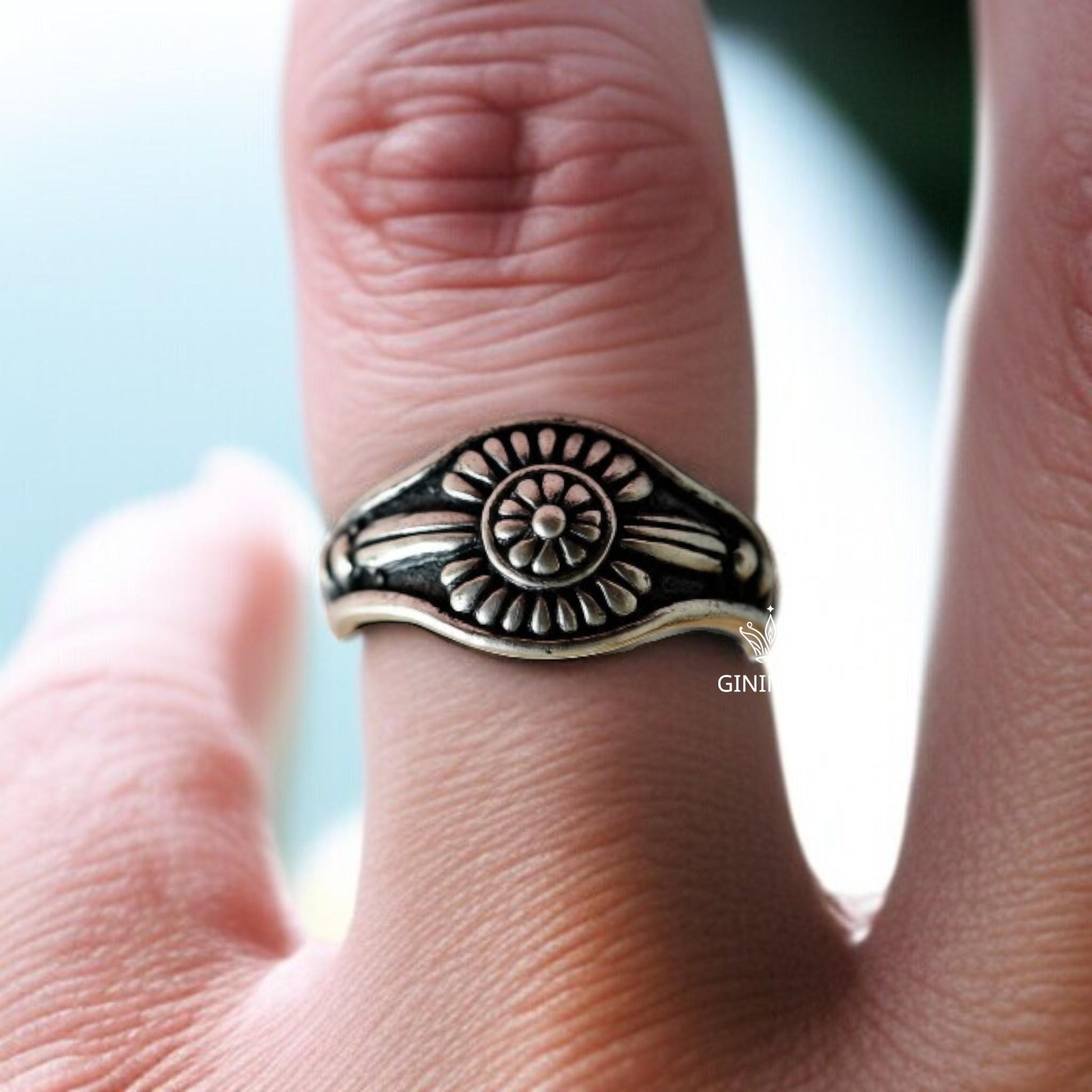 Oxidized Silver Flower Ring β Handmade 925 Sterling Floral Band β Vintage Boho Statement Jewelry β Artisan Gift for Her by Ginimade