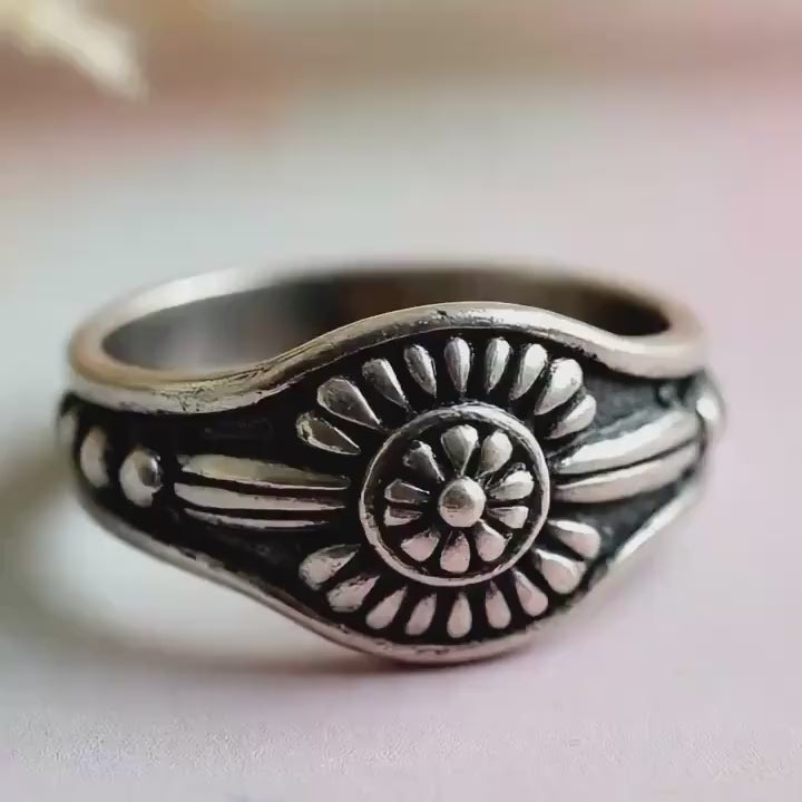 Celebrate tradition and craftsmanship with this beautiful floral oxidized silver ring, handcrafted in solid 925 sterling silver. Featuring a raised sunflower or mandala-inspired motif, this ring blends vintage charm with boho eleganceβperfect for daily wear or as a meaningful gift.