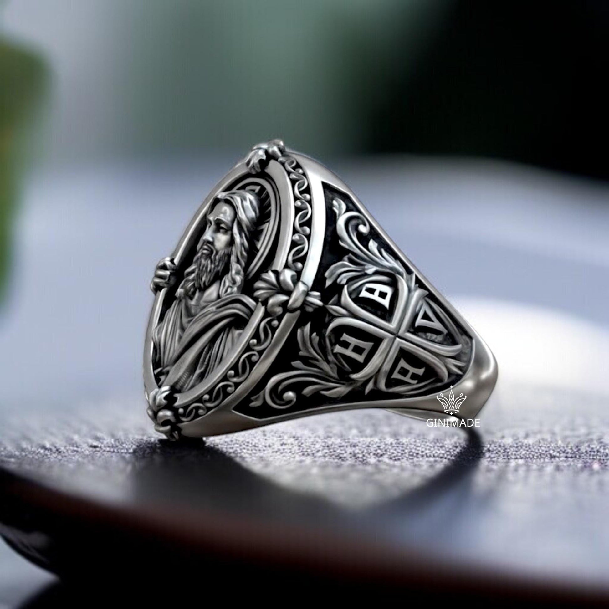 Personalized Jesus Christ Signet Ring | Sterling Silver Religious Ring for Men | Christian IHSV Cross Engraved Ring | Faith Gift for Him