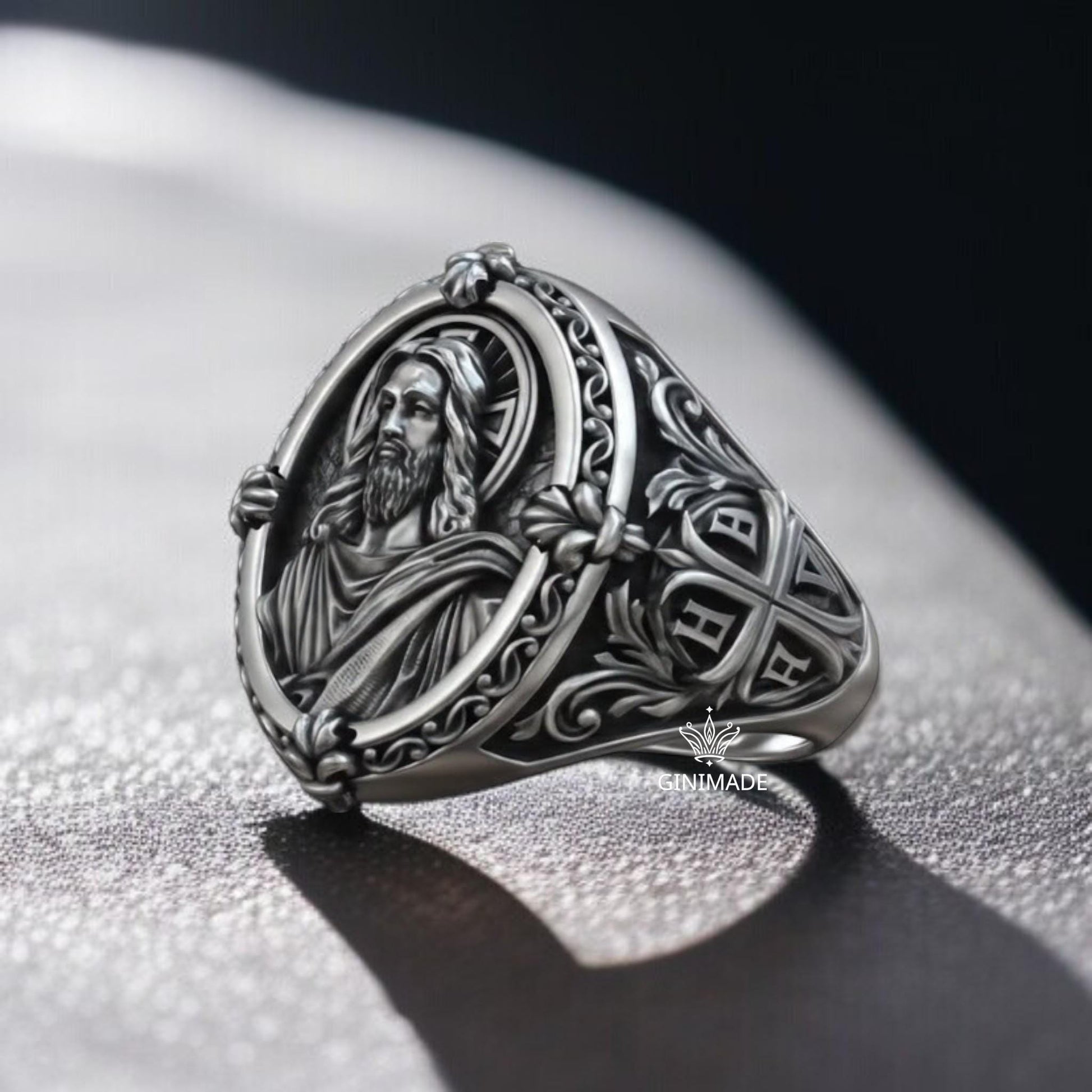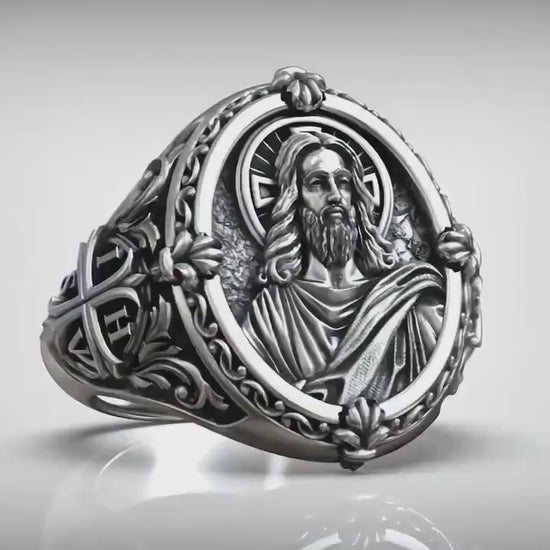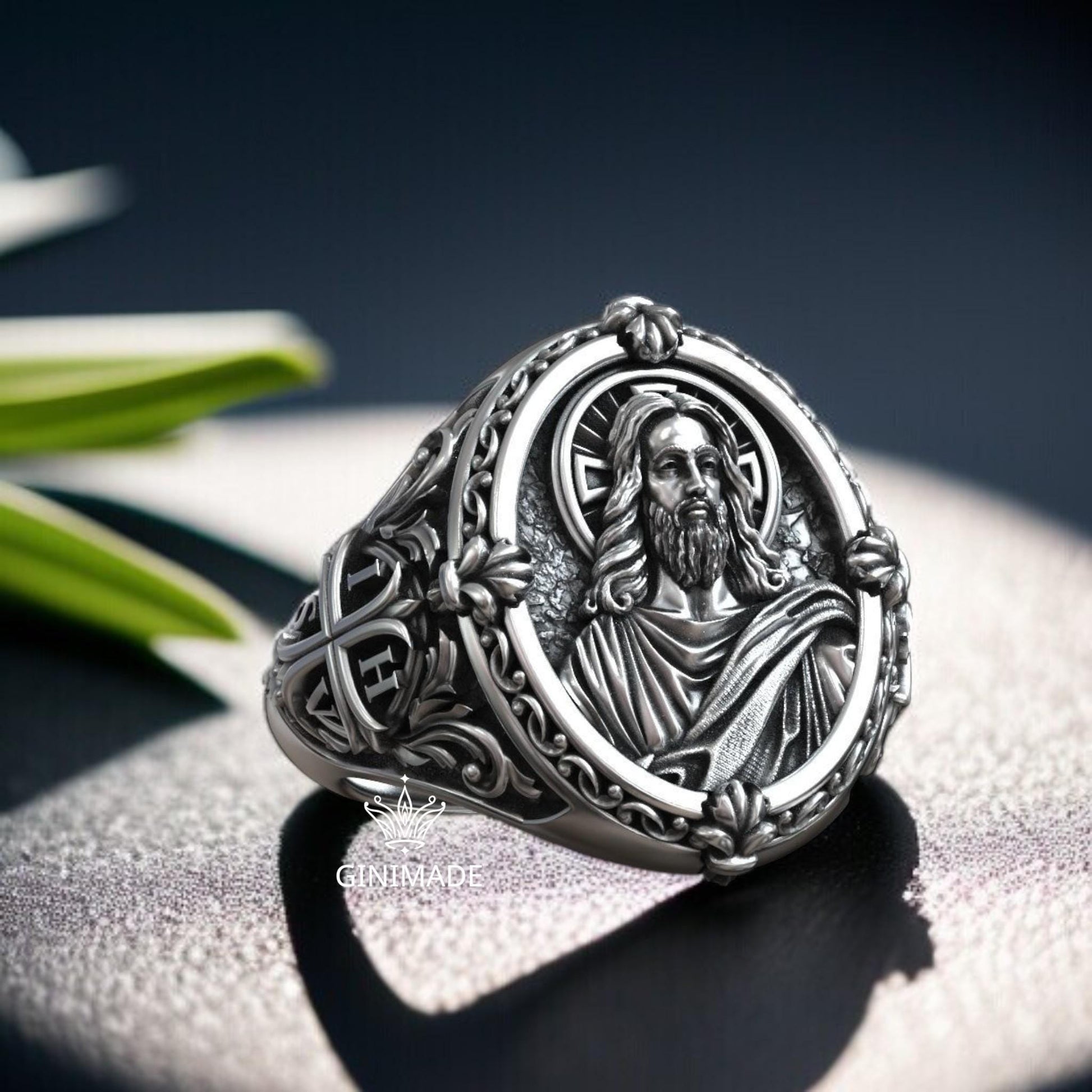 Honor your faith with this Personalized Jesus Christ Signet Ring, crafted with exquisite detail and deep spiritual meaning. This unique ring features a high-relief depiction of Jesus Christ at the center, surrounded by intricate IHSV cross engravings symbolizing divine protection and devotion. The band showcases ornate Christian motifs, blending classic religious art with a bold, masculine design.