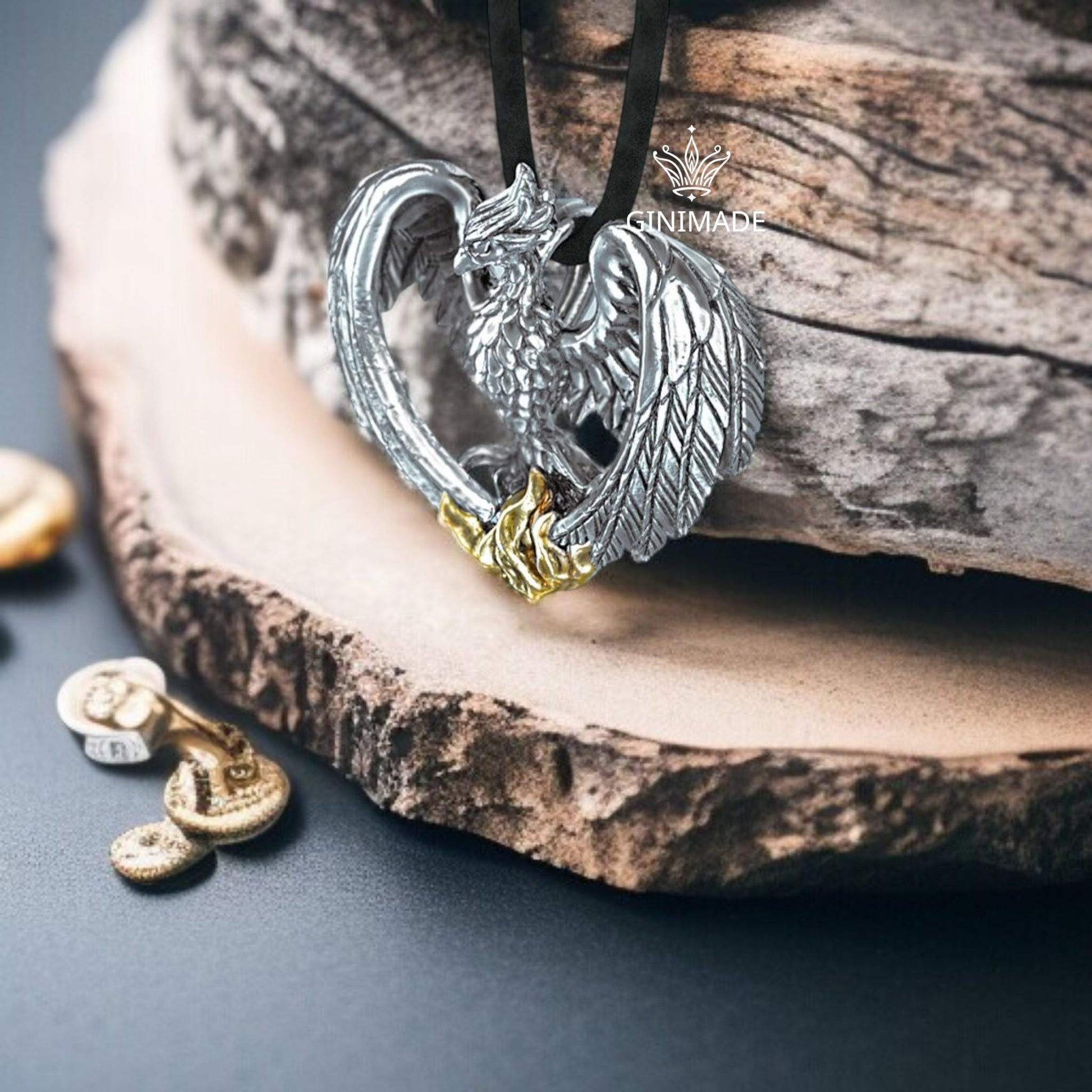 Phoenix Rising Pendant Necklace | Sterling Silver Phoenix with Golden Flames | Rebirth & Strength Jewelry | Gift for Him and her | GiniMade