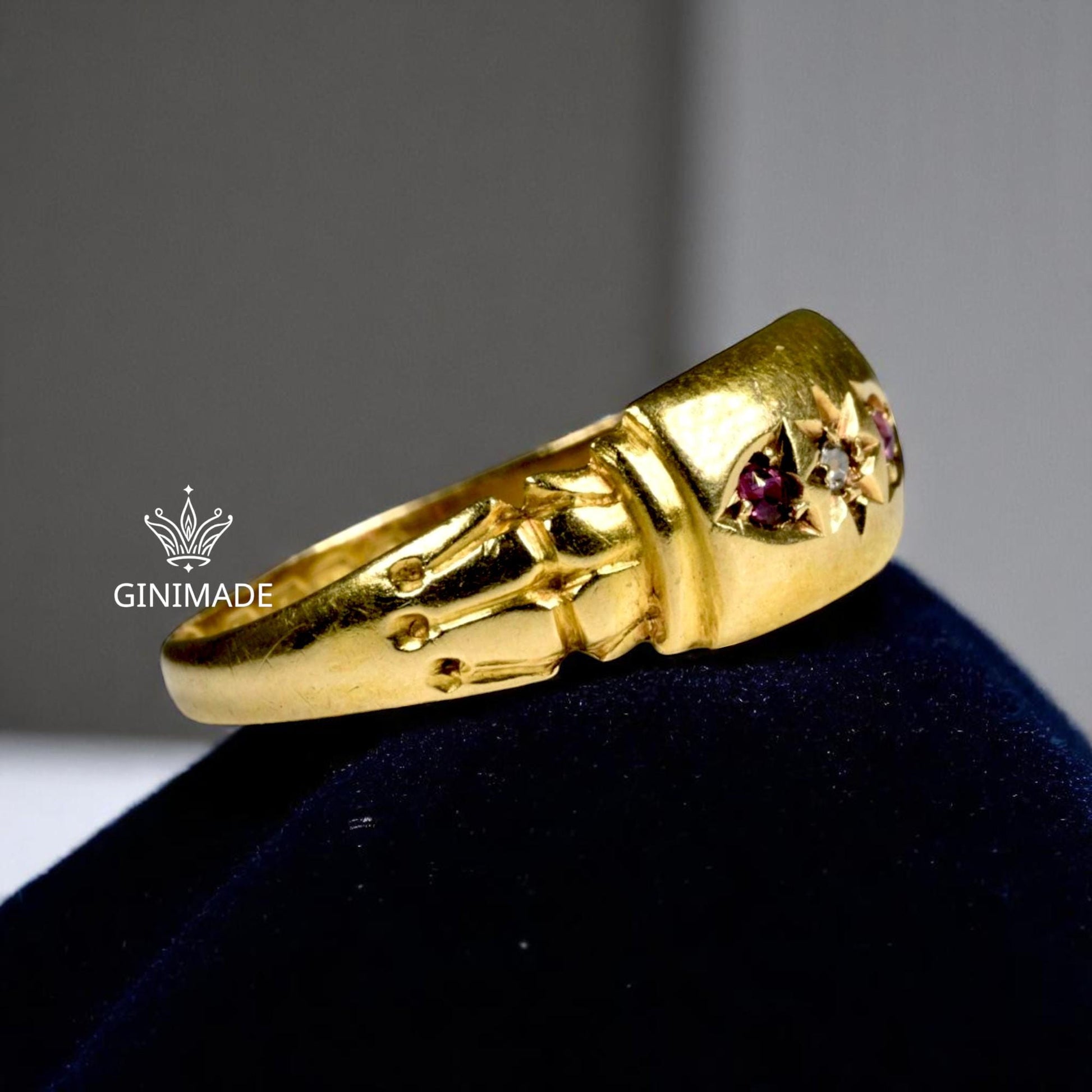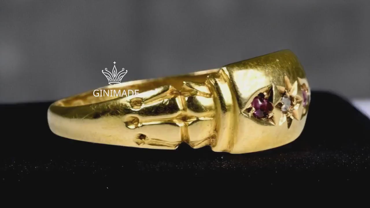 Our Vintage-Inspired CZ Diamond & Ruby Ring is a timeless piece that brings together bold beauty and antique elegance. Designed with a striking starburst motif at the center, this handcrafted ring features a shimmering cubic zirconia diamond flanked by two deep pink ruby stones — all set in a luxurious gold-toned band with intricate Victorian detailing.